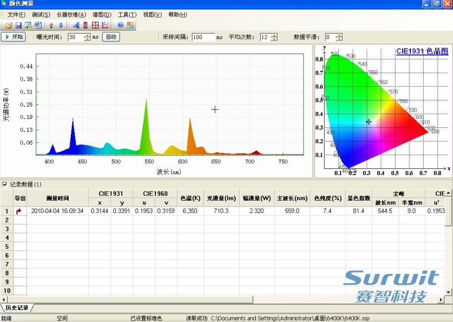 該功能采用國際上權(quán)威的全光譜法(無V(λ)修正誤差)測量LED、節(jié)能光源、熒光粉等的光譜功率分布、色品坐標、相關(guān)色溫、色偏差、色容差、峰值波長、顯色指數(shù)(Ra。測量波段范圍380nm~780nm。配套相應電氣設(shè)備可測量光源的電壓、電流、功率、功率因數(shù)等。產(chǎn)品的測量控制實現(xiàn)全部由計算機軟件完成,軟件操作簡單,并具強大的光源測試與數(shù)據(jù)分析處理功能,測量數(shù)據(jù)可以導出Excel、txt和ssp(光譜文件)等多種文件格式,非常便于分析人員計算分析。